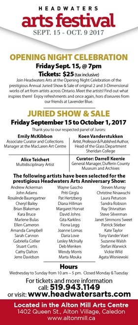 One of the most respected art shows in Ontario will open its doors Friday, September 15th - Sunday, October 1st, 2017. The Juried Art Show & Sale features works from over 40 artists across Ontario. The 2017 panel of jurors includes Emily McKibbon (Associate Curator and Collections Manager at the MacLaren Art Centre), Alice Teichert (Multidisciplinary Artist), Koen Vanerstukken (Head of the Glass Department at Sheridan College); and is curated by Darrell Keenie (General Manager, Dufferin County Museum and Archives).